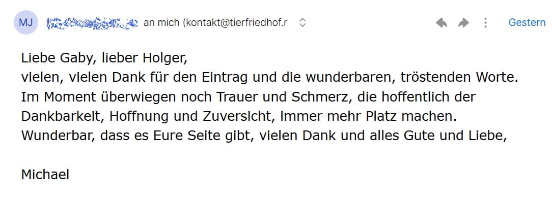 Diese virtuelle Gedenkstätte für Tiere ist entstanden, weil wir selbst schon in der Vergangenheit schmerzende Verluste erlitten haben und so unser Trauer Ausdruck geben konnten. Glaube mir, es hilft ungemein, seinem geliebten Schatz über die Regenbogenbrücke zu schicken und hier eine ewige Ruhestätte zu wissen, zu der Du wann immer Du willst jederzeit zurückkehren kannst!
